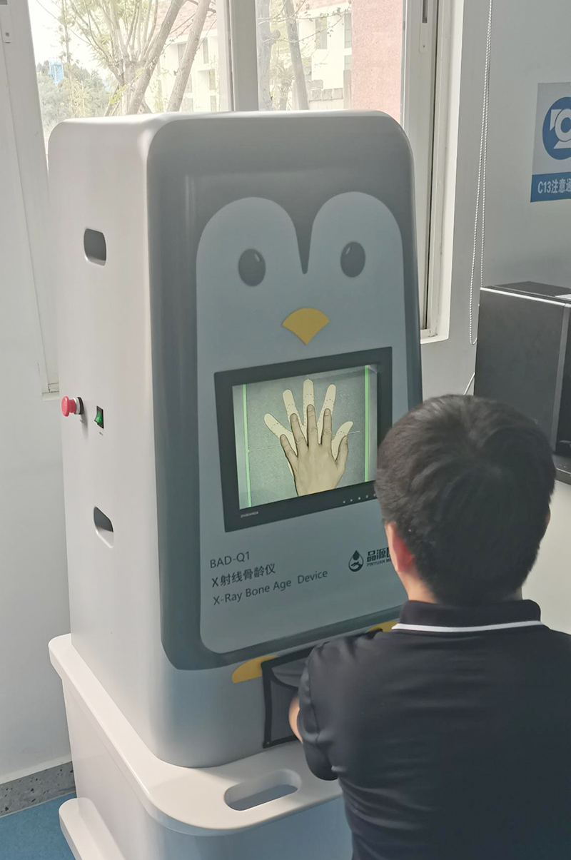 品源醫(yī)療X射線骨齡儀的便捷操作體驗(yàn)也為日常使用帶來(lái)便利。配備的手部限位圖、監(jiān)控屏監(jiān)控?cái)[位以及軟件視頻監(jiān)控功能組成的三方位定位系統(tǒng),能幫助操作人員快速、準(zhǔn)確地定位檢測(cè)區(qū)域,減少重復(fù)拍攝,提升檢測(cè)效率。雙監(jiān)控顯示窗口的設(shè)計(jì),使操作人員與被檢者可同步觀察擺位情況,增強(qiáng)檢測(cè)過(guò)程的透明度與互動(dòng)性。此外,BAD-Q1采用企鵝造型的卡通化外觀設(shè)計(jì),色彩柔和,兒科專用參數(shù)設(shè)置避免過(guò)度曝光,充分考慮受檢人群心理與生理特點(diǎn),緩解在檢測(cè)時(shí)的緊張情緒,保障檢測(cè)的安全性與舒適性。