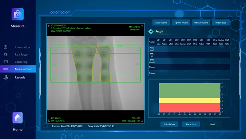 雙能X射線骨密度儀軟件:以雙能X射線骨密度儀DXA 800E為例,其軟件運用雙能X射線吸收測量法,設備發(fā)射出低能和高能兩種不同能量的X射線束,同時照射人體骨骼部位,通過測量不同能量X射線穿過骨骼后的衰減程度,計算機精確計算出骨骼的礦物質(zhì)含量,即骨密度。該軟件操作簡便快捷,整個檢查過程通常只需幾分鐘,能自動生成專業(yè)報告,大幅提升科室工作效率。