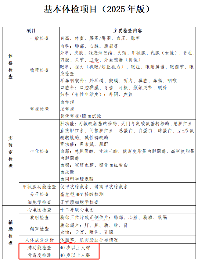 肺功能檢查、骨密度檢測為40歲及以上人群必做項;